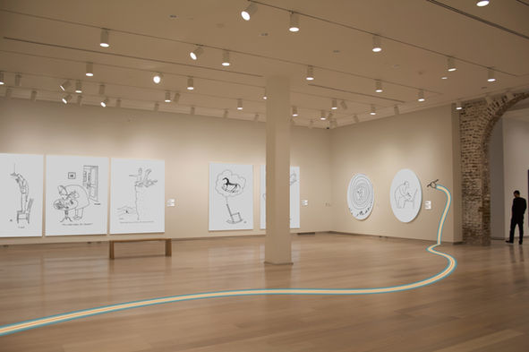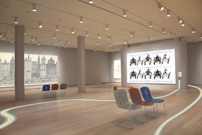 The SCAD Museum of Art requested my team to design a custom layout and promotional materials for an upcoming exhibition of works by Saul Steinberg, best known for his six decade career as a New Yorker cartoonist. We built our designs around Steinberg’s loose and playful approach to line to make the viewer feel as though they were stepping into one of his works. The final deliverables included viewing chairs and promotional postcards around some of Steinberg’s iconic characters. We were also tasked to design themed Enchroma glasses to ensure individuals with color blindness